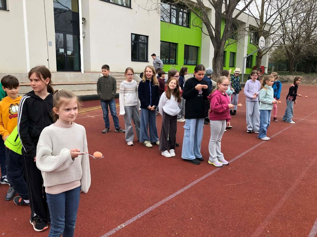 • A mozgásos, ügyességi állomáson elsőként a húsvéti tojásgurítás népszokása elevenedett meg, majd nyusziugró verseny következett, aztán kanálban lévő tojásokkal futottak diákjaink, végül „forró tojás” játékkal zárult a sor.