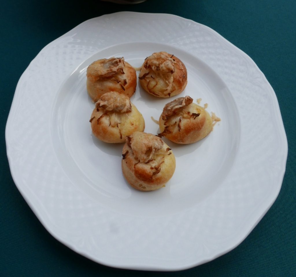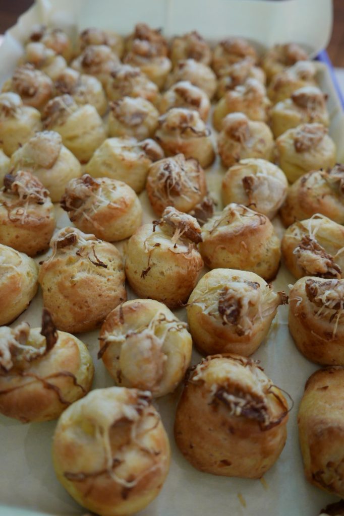 le konyharuhával, és pihentessük 30 percig. A tésztát lisztezett felületen nyújtsuk 2 cm vastagra, vagdaljuk be a tetejüket, majd pogácsaszaggatóval szúrjuk ki. Tetejüket a felvert tojással kenjük le!