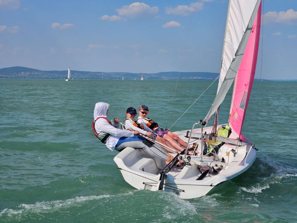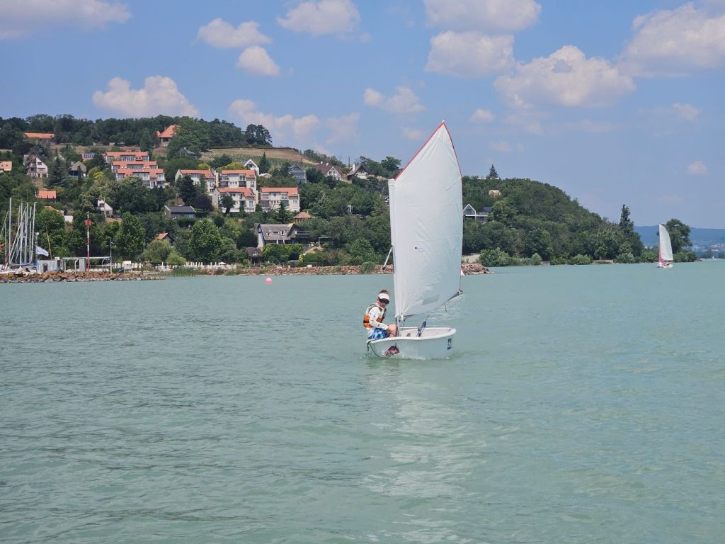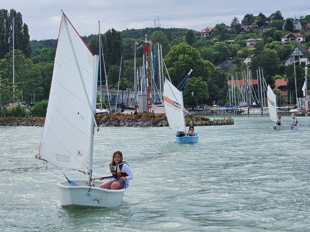 Utolsó nap a reggeli átmozgatás és játék után szobarend és az ágyak lehúzatolása következett. Majd gyakorlás a délutáni bemutatóra, ahol a szülők megnézhették kinek hogy megy a fordulás hausolás, félszél, negyedszél és háromnegyed szelezés a bólyák kerülésével. A nagy izgalom ellenére a szülők tátott szájjal nézték, milyen ügyesen és jól manővereznek a kikötőben és állítják vitorláikat az ifjú kadétok. Nagyon büszke voltam rájuk, hogy ennyi mindent sikerült megtanítanom nekik a vakáció első hetében. Sok maradandó élményt szereztek rengeteget mozogtak a szabadban és még telefonozni sem maradt idejük (kedvük). 🙂
